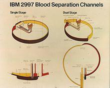 The earliest roots of IBM's development of the IBM 2997 Blood cell Separator lay in the personal tragedy of one of IBM's development engineers, George Judson. In 1962, Judson's son, Tom, was diagnosed with leukemia. His physician was able to have Tom admitted to the Clinical Center of the National Cancer Institute (NCI) at the National Institutes of Health (NIH). On admission, they showed Judson a procedure to remove white blood cells from a patient. It was laborious. They would remove two units (450 ml) of blood, spin them in a bucket centrifuge, express the plasma into a satellite bag, and the white cells into another satellite bag. The packed red cells and the plasma would be recombined and administered to the patient. This would be repeated over and over. Judson, being an engineer, suggested that this could be done on a continuous-flow basis. He was sent to see Dr. Emil J. Freireich who expressed enthusiasm for the project. Judson returned to IBM and asked for a year's leave of absence to work on his ideas. IBM gave him the one-year leave with pay and provided engineering assistance. His work led to the development of the NCI Blood Cell Separator and later to the IBM 2990 Blood Cell Separator which could harvest white blood cells from blood donors, to support leukemia patients to keep them alive. The subsequent development of the machine as the IBM 2997, essentially a continuous centrifuge which separated the blood into red blood cells, white blood cells, and blood plasma (used in plasmapheresis), was picked up by IBM's Systems Supplies Division (SSD) which was already ready marketing the IBM 2991 Blood cell Processor. The (disposable) supplies element represented a large part of the revenue stream.[1]