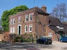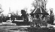 'The Pump' is a significant local landmark. Donated to the village by Charlotte Gell, this water pump stands close to the village pond at the intersection of Swakeleys Road and Long Lane. After Gell's death in 1863, under the provisions of her will a water pump was sunk for the benefit for the community in 1866. The village pond next to the pump was dug at the same time as the 144-foot (44 m) well for the pump was sunk to accommodate waste from the construction.[14] An older pond on the other side of the village was filled in with the excavated earth from the new one.[15] In 1857 Gell had also donated some of her land near St Giles's Church for five almshouses to be built for longstanding servants of the Gell household or Ickenham residents who were members of the Church of England. No more than three people were allowed to live in the houses at one time. The cottages remain and are maintained by the local church. Next to the pump stands the Coach & Horses public house, first licensed for the sale of alcohol in 1759 but of 16th-century origin. The house was used for manorial courts throughout the 19th century until the last was held in 1878.[16]