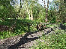 The Pynchester Moat is a Scheduled Ancient Monument on the River Pinn just east of Copthall Road West.[68] Although usually dry in the summer months, the moat surrounding the location of a manor house can still be seen. Excavations of the site between 1966 and 1969 found pottery and an oven dating back to the 14th or 15th century.[69] It is believed the manor house at the centre of the moat was "Pynchester", a building owned by the Hastings family in the 16th century.[70]