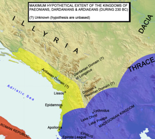 - ^ Wilkes, J. J. The Illyrians, 1992, p. 120, ISBN 0-631-19807-5., Page 163, "Unlike Teuta in 229 BC, Demetrius was prepared for the Roman invasion. He placed a garrison in Dimale (Dimallum), a fortress inland ..."