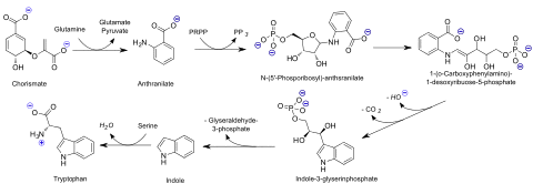 Indole is biosynthesized in the shikimate pathway via anthranilate.[2] It is an intermediate in the biosynthesis of tryptophan, where it stays inside the tryptophan synthase molecule between the removal of 3-phospho-glyceraldehyde and the condensation with serine. When indole is needed in the cell, it is usually produced from tryptophan by tryptophanase.[7]