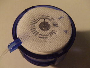 An infusion set is used with devices such as an insulin pump. The purpose of an infusion set is to deliver insulin under the skin, fulfilling a similar function like an intravenous line.[1] It is a complete tubing system to connect an insulin pump to the pump user and as such includes a subcutaneous cannula, adhesive mount, quick-disconnect, and a pump cartridge connector.