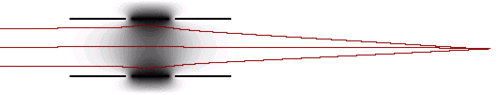 The cylinder lens consists of defocusing lens, a focusing lens and a second defocusing lens, with the sum of their refractive powers being zero. But because there is some distance between the lenses, the electron makes three turns and hits the focusing lens at a position farther away from the axis and so travels through a field with greater strength. This indirectness leads to the fact that the resulting refractive power is the square of the refractive power of a single lens.