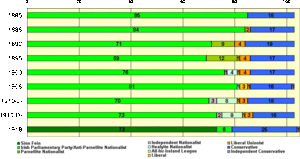 Note: Results from Ireland for the UK general elections contested by the Irish Unionist Alliance.[28] These figures do not include MPs elected for the Liberal Unionists, who were officially a separate party. IUA MPs sat with the Liberal Unionists and Conservatives at Westminster, and were often simply called 'Conservatives' or 'Unionists'.