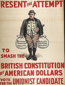 Throughout the period, members of the IUA campaigned not only in Ireland, but also in Britain alongside the Conservative Party. This was especially the case in the two general elections of 1910. In December 1910 the IUA sent 278 workers to British constituencies to assist the Conservative candidates, distributing almost three million leaflets across England.[6] It was during that this time that a large number of Conservative MPs married into Irish Southern Unionist families.