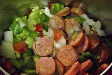 Jambalaya (/ˌdʒæmbəˈlaɪ.ə/ JAM-bə-LY-ə, /ˌdʒʌm-/ JUM-) is a Creole rice dish of West African, French (especially Provençal cuisine), and Spanish influence, consisting mainly of meat and vegetables mixed with rice. Traditionally, the meat always includes sausage of some sort, often a smoked meat such as andouille, along with pork or chicken and seafood (less common), such as crawfish or shrimp. The vegetables are usually a sofrito-like mixture known as the "holy trinity" in Cajun cooking, consisting of onion, celery, and green bell pepper, though other vegetables such as okra, carrots, tomatoes, chilis and garlic are also used. After browning and sauteeing the meat and vegetables, rice, seasonings and broth are added and the entire dish is cooked together until the rice is done.