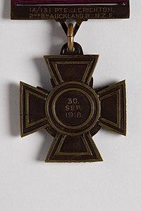 Crichton was awarded the Victoria Cross (VC) for his deeds of 30 September 1918.[1] The VC, instituted in 1856, was the highest gallantry award that could be bestowed on a soldier of the British Empire.[10] The citation for his VC read: