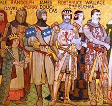 Traditional Scottish accounts dating from the 1370s state that during the battle, Thomas Randolph, 1st Earl of Moray commanded the vanguard, the left wing though nominally led by the young Walter Stewart was commanded by his cousin Douglas, Edward Bruce took the right wing, and King Robert the rearguard.[12][13] However, contemporary English accounts state that the Scottish army consisted of three units, so the idea that Douglas and Stewart commanded a unit could be a later invention or the English account is simply mistaken.[14]