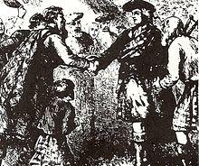 Oglethorpe fought in the British Army during the Jacobite rising of 1745. By then a major-general, he took command of troops that were mustering in York, England, about 600 men. Scots invading under Charles Edward Stuart penetrated into England. Oglethorpe was tasked with intercepting retreating Scots before they reached Preston, Lancashire in December 1945. On the 17th, he was initially ordered to engage with the rear of the Scots, led by George Murray, at Shap. The orders were amended to trap the Scots in town early the next morning upon Oglethorpe's intelligence, but the Scots left as the orders were changed. The following day, Oglethorpe travelled to Clifton and took a bridge from the Scots before the Clifton Moor Skirmish that evening. At the skirmish, the British were defeated. Because Oglethorpe had allowed Scots to escape from Shap, he was blamed with the defeat, accused of disobeying orders, and potentially being a Jacobite. The following year, Oglethorpe was court martialled for his actions. After a lengthy defense, he was acquitted by a panel of twelve high-ranking military officials, led by Thomas Wentworth.[105] On September 19, 1747, Oglethorpe was promoted to lieutenant general.[106] However, the Duke of Cumberland, who had been in command at Clifton Moor, 'blacklisted' Oglethorpe from holding command.[105]