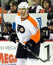 On 1 July 2011, Jágr returned to the NHL, but rather than signing with his original NHL team in Pittsburgh, he signed a one-year, $3.3 million contract with the Philadelphia Flyers, the Penguins' cross-state rival.[18] He scored his 1,600th NHL point during his debut game with the Flyers, assisting on a Claude Giroux goal as the Flyers won their season opener 2–1 over the Boston Bruins on 6 October 2011. Typically playing on the first line with Giroux and Scott Hartnell, Jágr was among the top scorers during the start of the 2011–12 season. He scored his first and second goals as a Flyer on 24 October against the Toronto Maple Leafs.[19] On 29 October 2011, against the Carolina Hurricanes, he scored his 650th and 651st NHL goals.[20] He scored his only goal of the 2012 playoffs during Philadelphia's series against Pittsburgh. The Flyers were eliminated by the New Jersey Devils, who would ultimately become the 2012 Eastern Conference champions.