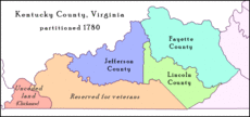 Jefferson County—originally Jefferson County, Virginia—was established by the Virginia General Assembly in June 1780, when it abolished and partitioned Kentucky County into three counties: Fayette, Jefferson and Lincoln. Named for Thomas Jefferson, who was governor of Virginia at the time,[4] it was one of Kentucky's nine original counties on June 1, 1792.