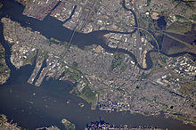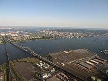 Part of the New York metropolitan area, Jersey City is bounded on the east by the Hudson River and Upper New York Bay and on the west by the Hackensack River and Newark Bay. A port of entry, with 30.7 miles (49.4 km) of waterfront and extensive rail infrastructure and connectivity,[34] the city is an important transportation terminus and distribution and manufacturing center for the Port of New York and New Jersey. Jersey City shares significant mass transit connections with Manhattan.[35][36] Redevelopment of the Jersey City waterfront has made the city one of the largest centers of banking and finance in the United States and has led to the district and city being nicknamed Wall Street West.[37]