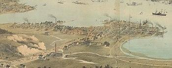 Soon after the Civil War, the idea arose of uniting all of the towns of Hudson County east of the Hackensack River into one municipality. A bill was approved by the state legislature on April 2, 1869, with a special election to be held on October 5, 1869. An element of the bill provide that only contiguous towns could be consolidated. While a majority of the voters across the county approved the merger, the only municipalities that had approved the consolidation plan and that adjoined Jersey City were Hudson City and Bergen City.[51] The consolidation began on March 17, 1870, taking effect on May 3, 1870.[52] Three years later the present outline of Jersey City was completed when Greenville agreed to merge into the Greater Jersey City.[49][53]