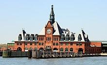 In the late 1880s, three passenger railroad terminals opened in Jersey City next to the Hudson River (Pavonia Terminal,[54] Exchange Place and Communipaw).[55][56] Tens of millions of immigrants passed through these stations as they made their way westward from Ellis Island into the United States.[55] The railroads transformed the geography of the city by building the Erie Cut as well as several large freight rail yards.[57][58] The railroads became and would remain the largest employers in Jersey City into and during the early 20th century.