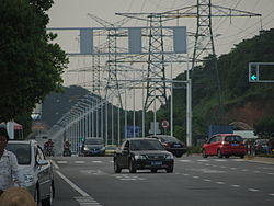 Jiangmen has a mature network of inter-city and intra-city highways and expressways, whose total length has reached 10,084.97 kilometres (6,266.51 mi) as of 2016.[15] G15 Shenyang–Haikou Expressway travels at the north, connecting downtown Jiangmen to three of its administrative divisions Heshan, Kaiping and Enping, as well as nearby cities Yangjiang, Zhongshan and Foshan. S32 Western Costal Expressway goes along Jiangmen's coastlines, linking Zhuhai at the east and Yangjiang at the west. G94 Pearl River Delta Ring Expressway, S20 Guangzhou-Zhongshan-Jiangmen Expressway, G2518 Shenzhen-Cenxi Expressway and S47 Guangzhou-Foshan-Jiangmen-Zhuhai Expressway run through northeast Jiangmen. S49 Xinhui-Taishan Expressway connects Taishan and joints S32 at the south.