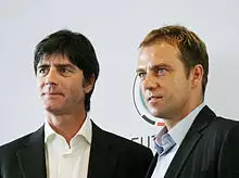 Löw changed the 4–4–2 system after the group stages to a 4–2–3–1 system, and left striker Mario Gómez out of the starting lineup. Though he was forced to watch from the sidelines, his team defeated Portugal 3–2.[45] In the quarter-final, Löw was banned from giving any directions to his team even through telephone calls. Later Löw declared that he had put seven different scenarios with his assistant Hansi Flick in order to contain Portugal.[46] In an exciting match against Turkey in the semi-finals, Germany won 3–2.[47] Germany then lost 1–0 to Spain in the final on 29 June 2008.[48]