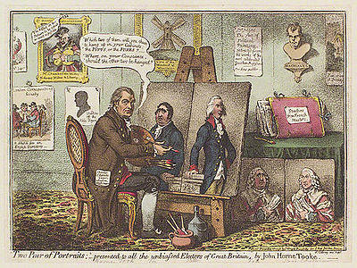 Between 1782 and 1790 Horne Tooke gave his support to Pitt, and in the election for Westminster, in 1784, threw all his energies into opposition to Fox. With Fox he was never on terms of friendship, and Samuel Rogers, in his Table Talk, asserts that their antipathy was so pronounced that at a dinner party given by a prominent Whig not the slightest notice was taken by Fox of the presence of Horne Tooke. It was after the election of Westminster in 1788 that Horne Tooke depicted the rival statesmen (Lord Chatham and Lord Holland, William Pitt and Charles James Fox) in his celebrated pamphlet Two Pair of Portraits.[4]