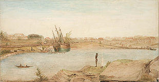 Lewin and his wife were granted a small farm near Parramatta, but by 1808 they were living in Sydney where the artist advertised his services as a portrait miniaturist. Governors Philip Gidley King and William Bligh were early patrons. Governor Macquarie, recognising the usefulness of a professional artist to his schemes for the colony, and to guarantee him an income, appointed him city coroner in 1810, and included him in the 1815 official inspection party of new lands discovered beyond the Blue Mountains. Lewin's watercolours of this expedition are now held by the State Library of New South Wales.[8] Macquarie also commissioned illustrations of plants collected by the surveyor-general, John Oxley, in his explorations of the country beyond Bathurst, the Liverpool Plains and New England.