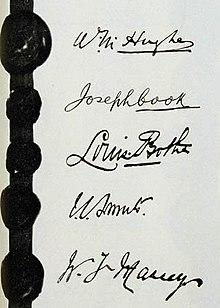 In 1894, however, Cook was the leader of those parliamentarians who refused to accept the Labor Party's decision to make all members sign a "pledge" to be bound by decisions of the Parliamentary Labor Party (Caucus).[5] Cook's protest was based on Labor's attitude to the tariff question in particular, with his preference for free trade being increasingly at odds with his party.[8] By the end of the year, he had become a follower of George Reid's Free Trade Party, and for years afterwards he was seen as a 'class traitor' by Labor.[5] He became an invaluable ally of Reid, despite the fact that the two men had distinctly different characters, and remained colleagues only at a distance.[6]