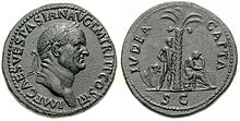 When the Roman Empire invaded ancient Judea, thick forests of date palm up to 80 feet (24 m) high and 7 miles (11 km) wide covered the Jordan River valley from the Sea of Galilee in the north to the shores of the Dead Sea in the south. The tree so defined the local economy that the Roman emperor Vespasian celebrated the reconquest after the First Jewish Revolt (66-70 CE) by minting Judaea Capta coinage, a series of coins sometimes depicting Judaea as a mourning woman beneath a date palm. The palm tree can appear on the coin either in combination with the mourning woman, or without her.[9] Andrea Moresino-Zipper contests that in the former case, it is the woman who symbolises the defeated Judaea and the towering, dominating palm stands for victorious Rome, while in the latter case the palm tree does represent Judaea.[9]