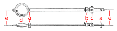 Kater built a pendulum consisting of a brass rod about 2 meters long, 1½ inches wide and one-eighth inch thick, with a weight (d) on one end.[1][9] For a low friction pivot he used a pair of short triangular 'knife' blades attached to the rod. In use the pendulum was hung from a bracket on the wall, supported by the edges of the knife blades resting on flat agate plates. The pendulum had two of these knife blade pivots (a), facing one another, about a meter (40 in) apart, so that a swing of the pendulum took approximately one second when hung from each pivot.