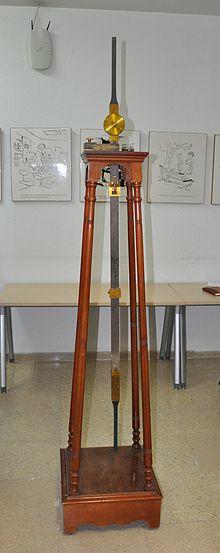 A Kater's pendulum is a reversible free swinging pendulum invented by British physicist and army captain Henry Kater in 1817[1] for use as a gravimeter instrument to measure the local acceleration of gravity. Its advantage is that, unlike previous pendulum gravimeters, the pendulum's centre of gravity and center of oscillation do not have to be determined, allowing a greater accuracy. For about a century, until the 1930s, Kater's pendulum and its various refinements remained the standard method for measuring the strength of the Earth's gravity during geodetic surveys. It is now used only for demonstrating pendulum principles.