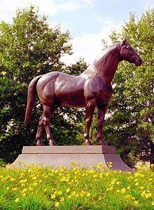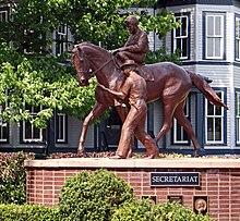 A number of horse sculptures stand in the Kentucky Horse Park, including a Man o' War statue on a pedestal near the entrance, over the horse's grave, which was moved here from Faraway Farm during the establishment of the park in the 1970s. There is also a life-size statue of the 1973 U.S. Triple Crown winner Secretariat with jockey Ron Turcotte aboard being led by groom Eddie Sweat, sculpted by Jim Reno. From harness racing, there is a statue of Bret Hanover.