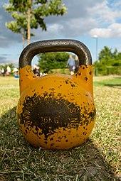 The Russian girya (ги́ря, plural ги́ри giri) was a type of metal weight, primarily used to weigh crops in the 18th century. The use of such weights by circus strongmen is recorded for the 19th century. They began to be used for recreational and competition strength athletics in Russia and Europe in the late 19th century. The birth of competitive kettlebell lifting or girevoy sport (гиревой спорт) is dated to 1885, with the founding of the "Circle for Amateur Athletics" (Кружок любителей атлетики).[2] Russian girya are traditionally measured in weight by pood, corresponding to 16.38 kilograms (36.1 lb).[3] The English term kettle bell has been in use since the early 20th century.[4]