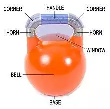 The parts of the kettlebell can be broken down into: handle, corners, horns, window, bell, and base.