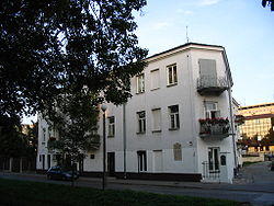 In April 1941, the Kielce Ghetto was formed, surrounded by high fences, barbed wire, and guards.[13] The gentile Poles were ordered to vacate the area and the Jews were given one week to relocate. The ghetto was split in two, along Warszawska Street (Nowowarszawska) with the Silnica River (pl) running through it.[10] The so-called large ghetto was set up between the streets of Orla, Piotrkowska, Pocieszka, and Warszawska to the east, and the smaller ghetto between Warszawska on the west, and the streets of Bodzentyńska, St. Wojciech, and the St. Wojciech square. The ghetto gates were closed on 5 April 1941; the Jewish Ghetto Police was formed with 85 members and ordered to guard it.[14] Meanwhile, expulsions elsewhere and deportations to Kielce continued until August 1942 at which time there were 27,000 prisoners crammed in the ghetto. Trains with Jewish families arrived from the entire Kielce Voivodeship, and also from Vienna, Poznań, and Łódź.[10]