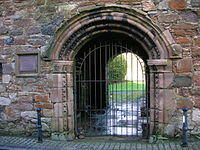Persistent rumours exist of a two-mile long ley tunnel which is said to run from Kilwinning Abbey, under the 'Bean Yaird', below the 'Easter Chaumers' and the 'Leddy firs', then underneath the River Garnock and the Lugton Water on to Eglinton Castle. No evidence exists for it, although it may be related to the underground burial vault of the Montgomeries which does exist under the old abbey[71] or to the main sewer that would have led from the monastery to the river.[72][73] Another tunnel is said to run from the abbey to its former property of Monkredding House on the road to Auchentiber.