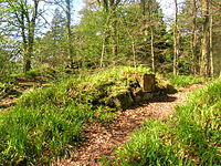 Evidence for these chapels is the Chapelcroft farm that existed near Laigh Moncur, becoming the old deer shelter in the Deer Park, and a Chapel Bridge over the Lugton Water.[61] A John Rankin in 1694 is recorded as living at an 'Eglinton Chapel'.[62] The Weirston chapel is said to have been the private chapel of the Montgomerie family, dedicated to Saint Wyssyn and in use up to as late as 1570.[63][64] Father Elmerides Hentyson may have been their priest.[64] The placename 'Ladyha' survives near Weirston, a likely reminder of our 'Lady', the Virgin Mary; farms here of this name are recorded in the Hearth Tax records of the 1690s.