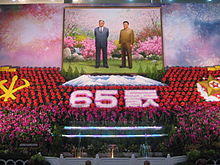 Kim Jong-il was the focus of an elaborate personality cult inherited from his father and founder of the DPRK, Kim Il-sung. Kim Jong-il was often the centre of attention throughout ordinary life in the DPRK. On his 60th birthday (based on his official date of birth), mass celebrations occurred throughout the country on the occasion of his Hwangab.[45] In 2010, the North Korean media reported that Kim's distinctive clothing had set worldwide fashion trends.[46]