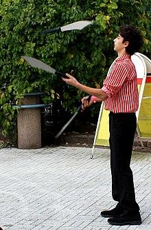 Knife juggling is a variant of toss juggling using blunt knives as props which are thrown and caught. Although knives are sometimes juggled recreationally, it is generally a performance art. Knife juggling is typically seen performed by street entertainers as part of a routine, or at art or historical festivals.