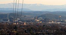 According to the United States Census Bureau, the city has a total area of 104.2 square miles (269.8 km2), of which 98.5 square miles (255.2 km2) is land and 5.6 square miles (14.6 km2), or 5.42%, is water.[64] Elevations range from just over 800 feet (240 m) along the riverfront to just over 1,000 feet (300 m) on various hilltops in West Knoxville,[65][66] with the downtown area resting at just over 900 feet (270 m).[67] High points include Sharp's Ridge in North Knoxville at 1,391 feet (424 m) and Brown Mountain in South Knoxville at 1,260 feet (380 m).[68][69] House Mountain, the highest point in Knox County at 2,064 feet (629 m), is located east of the city near Mascot.[70][71]