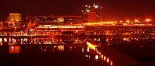 Development has also expanded across the Tennessee River on the South Knoxville waterfront. In 2006, the City of Knoxville adopted the South Waterfront Vision Plan, a long-term improvement project to revitalize the 750 acre waterfront fronting 3 miles of shoreline on the Tennessee River.[59] The project's primary focus is the commercial and residential development over a 20 year timeline.[59] The former Knoxville Baptist Hospital, located on the waterfront, was demolished in 2016 to make for mixed-use project called One Riverwalk.[60] The development consisted of three office buildings, including a new headquarters for Regal Entertainment Group, a hotel, student housing, and 300 multi-family residential units.[60]