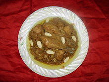 Korma or qorma is a dish originating in the Indian subcontinent,[1] consisting of meat or vegetables braised with yogurt (dahi) or cream, water or stock, and spices to produce a thick sauce or gravy.[2]
