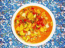 The English name is an anglicisation of Urdu qormā, meaning "braise".[3] It refers to the cooking technique used in the dish.[2][4] All these words, and the names of dishes such as ghormeh (Persian: قورمه) and the Azerbaijani qovurma or kavarma, are ultimately derived from a Turkic word qawirma, meaning "[a] fried thing".[3] The Indian korma is, however, possibly unrelated in a culinary sense to the modern Turkish kavurma or to some other dishes using the same root word, as they use widely varying techniques and ingredients.[5]