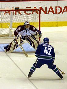 During the 2008 off-season, Wellwood broke a bone in his right foot while playing indoor soccer. With his contract set to expire, the Leafs placed him on waivers on June 24.[5] He was claimed the following day by the Vancouver Canucks and was subsequently signed to a one-year, $998,000 contract.[6][7] Reporting to training camp, he failed his initial fitness test and, although he passed a later evaluation,[8] he was a healthy scratch to begin the season. On October 17, after having played just one game for the Canucks, he was placed on waivers by the team;[9] after clearing, he was assigned to the Manitoba Moose of the AHL. Because the addition of Wellwood would have put the Moose over the limit for veteran players, Wellwood began assessing playing options in Europe; however, two days after clearing waivers, injuries to the Canucks prompted them to recall Wellwood to the NHL; he cleared re-entry waivers 24 hours later. Wellwood took advantage of this opportunity by scoring a goal and an assist in a 4–2 loss to the Columbus Blue Jackets, and he stuck with the club. Later in the season, on February 17, 2009, Wellwood ended a streak of 159 games without a penalty by taking a high-sticking penalty against the Calgary Flames. It was his first penalty since April 11, 2006.[10] Wellwood ended his first regular season in Vancouver with 18 goals and nine assists. Having never reached the Stanley Cup playoffs with Toronto, Wellwood made his NHL playoff debut with the Canucks in 2009 and scored his first NHL playoff goal in Game 4 of the first round against the St. Louis Blues, helping Vancouver complete a four-game sweep after a 3–2 overtime win.[11]
