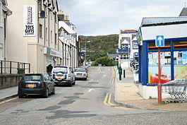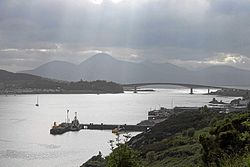 Kyle of Lochalsh (from the Gaelic Caol Loch Aillse, "strait of the foaming loch") is a village in the historic county of Ross-shire on the northwest coast of Scotland, located around 55 miles (90 km) west-southwest of Inverness. It is located on the Lochalsh peninsula, at the entrance to Loch Alsh, opposite the village of Kyleakin on the Isle of Skye. A ferry used to connect the two villages until it was replaced by the Skye Bridge, about a mile (2 km) to the west, in 1995.
