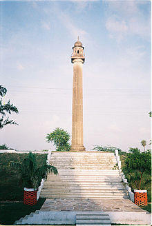 Constantia stands on a landscaped terrace overlooking what was once a lake, from the centre of which rises a solid fluted column with a Moorish cupola known as 'the Laat'. The monument is about forty metres (~125 feet) high, and is thought either to be a lighthouse or a marker for the grave of Claude Martin's horse.[8] Over the years, the Gomti River has edged closer, necessitating the construction of a river bund between the front terrace and 'the Lat'. In 1960, the grounds were flooded and the 1803 and 1934 earthquakes caused several statues to fall from their pedestals where they crown the architecture. The statues are in modern and older antique styles.