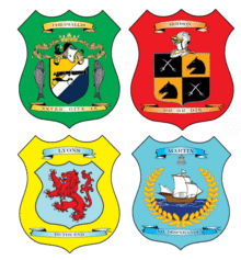 The La Martinière coat of arms was designed by the founder Claude Martin.[35] It is supported by seven flags, each bearing the design of a fish, the emblem of Oudh.[36] The devices on the escutcheon appear to epitomise Claude Martin's life. The ship recalls his voyage to India where he established his fortune. The lion with the pennant represents his career as an officer in the East India Company and with the Nawab of Oudh The setting sun behind the castellated building to the right of the shield has been said[35] to point to the sunset of his days and the large part which the building of "Constantia" played in his later years. The coat of arms and the accompanying motto Labore et Constantia are now shared by all the schools founded by Martin.