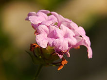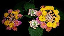 Lantana ((lan-tan-uh)) is a genus of about 150 species of perennial flowering plants in the verbena family, Verbenaceae. They are native to tropical regions of the Americas and Africa but exist as an introduced species in numerous areas, especially in the Australian-Pacific region, South and Northeastern part of India. The genus includes both herbaceous plants and shrubs growing to 0.5–2 m (1.6–6.6 ft) tall. Their common names are shrub verbenas or lantanas. The generic name originated in Late Latin, where it refers to the unrelated Viburnum lantana.[2]