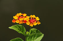 L. camara has small tubular shaped flowers, which each have four petals and are arranged in clusters in terminal areas stems. Flowers come in many different colours, including red, yellow, white, pink and orange, which differ depending on location in inflorescences, age, and maturity.[15] The flower has a tutti frutti smell with a peppery undertone. After pollination occurs the colour of the flowers changes (typically from yellow to orangish, pinkish, or reddish); this is believed to be a signal to pollinators that the pre-change colour contains a reward as well as being sexually viable, thus increasing pollination efficiency.[16]