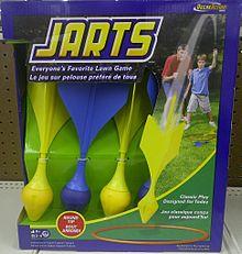 Lawn darts (also known as Javelin darts, jarts, lawn jarts or yard darts) is a lawn game for two players or teams. A lawn dart set usually includes four large darts and two targets. The game play and objective are similar to those of both horseshoes and darts. The darts are typically 12 inches (30 cm) long with a weighted metal or plastic tip on one end and three plastic fins on a rod at the other end. The darts are intended to be tossed underhand toward a horizontal ground target, where the weighted end hits first and sticks into the ground. The target is typically a plastic ring, and landing anywhere within the ring scores a point. After many injuries and deaths caused by lawn darts, they have been banned in the United States and Canada.