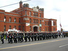 The regimental band, known as the Musique des Fusiliers de Sherbrooke, had previously ended its operations in the 1970s before was recreated in the early 1990s by order of Lieutenant Colonel Pierre Véronneau, who was the regimental commander at the time. It has had a history than spans long before the creation of the regiment in 1910. The band's first director, Lieutenant Serge Bélanger, led the band with a small group of musicians, laid the foundations for the band to be significantly expanded to a 30-member force. It is currently one of nine military bands that are located in the province of Quebec. In 1996, Captain Sylvain Côté took over as director of music, a position he still holds today. The regimental band supports the personnel of the regiment for various ceremonies and parades, as well as units in Estrie.[11] The band also has engaged in many charity concerts in Quebec.[12] In April 2013, the band donated $2,000 to musical organizations in the region.[13]