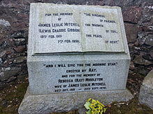 The Grassic Gibbon Centre was established in Arbuthnott in 1991 to commemorate the author's life. There is a memorial to him and his wife, and other members of the Mitchell family, in the western corner of the village churchyard (parish church of Saint Ternan) of Arbuthnott, nowadays in Aberdeenshire.
