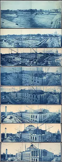 The Library of Congress reasserted itself during the latter half of the 19th century under Librarian Ainsworth Rand Spofford, who directed the Library from 1865 to 1897. Aided by an overall expansion of the federal government and a favorable political climate, Spofford built broad bipartisan support for the Library as a national library and a legislative resource, began comprehensively collecting Americana and American literature, and led the construction of a new building to house the Library, and transformed the Librarian of Congress position into one of strength and independence.[6] Between 1865 and 1870, Congress appropriated funds for the construction of the Thomas Jefferson Building, placed all copyright registration and deposit activities under the Library's control, and restored the Library's international book exchange. The Library also acquired the vast libraries of both the Smithsonian and historian Peter Force, strengthening its scientific and Americana collections significantly. By 1876, the Library of Congress had 300,000 volumes and was tied with Boston Public Library as the nation's largest library. When the Library moved from the Capitol building to its new headquarters in 1897, it had over 840,000 volumes, 40% of which had been acquired through copyright deposit.[6]