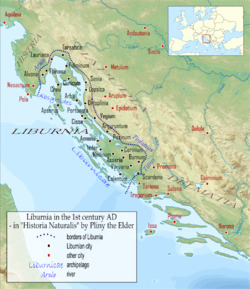 The Liburnians or Liburni (Ancient Greek: Λιβυρνοὶ)[1] were an ancient tribe inhabiting the district called Liburnia,[2][3][4] a coastal region of the northeastern Adriatic between the rivers Arsia (Raša) and Titius (Krka) in what is now Croatia. According to legend they populated Kerkyra until shortly after the Corinthians settled the island, c. 730 BC.