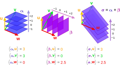 In mathematics, a linear form (also known as a linear functional,[1] a one-form, or a covector) is a linear map from a vector space to its field of scalars (often, the real numbers or the complex numbers).